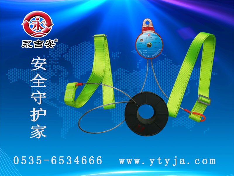 逃生緩降器由調速器、安全鉤、鋼絲繩、安全帶、掛架組成。